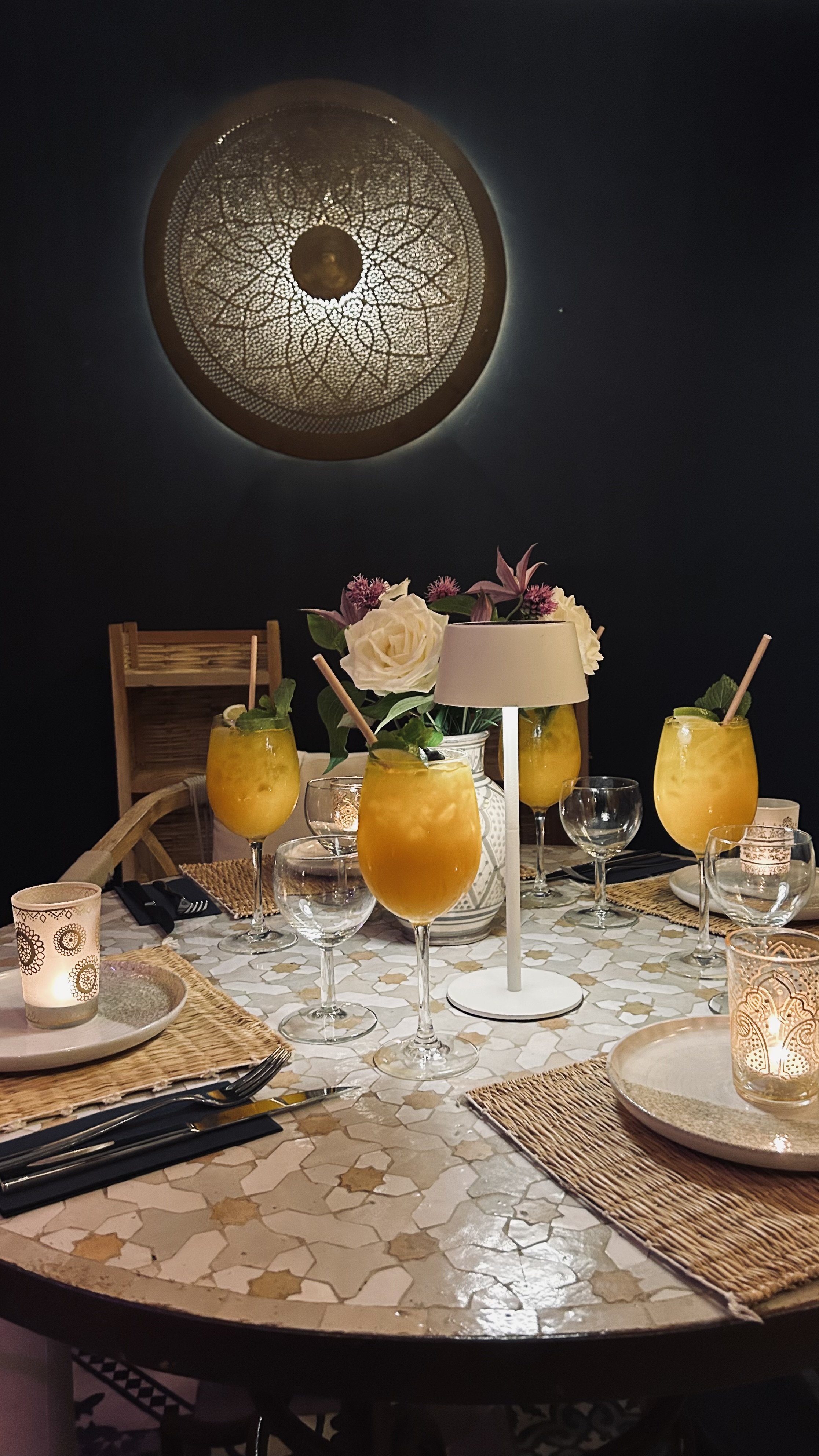 einem liebevoll dekorierten Tisch willkommen. Zur Einstimmung servieren wir unseren erfrischenden, alkoholfreien Mango Spritz.